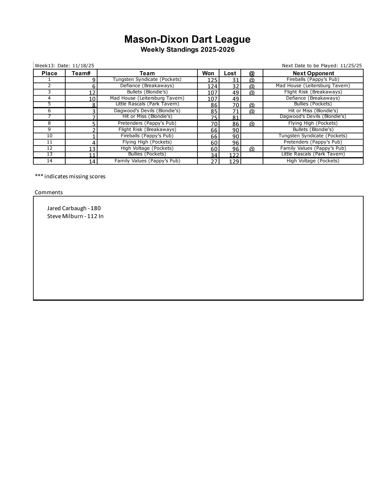 Week 13 Standings — HTML (easy load) or PDF (printer ready)
