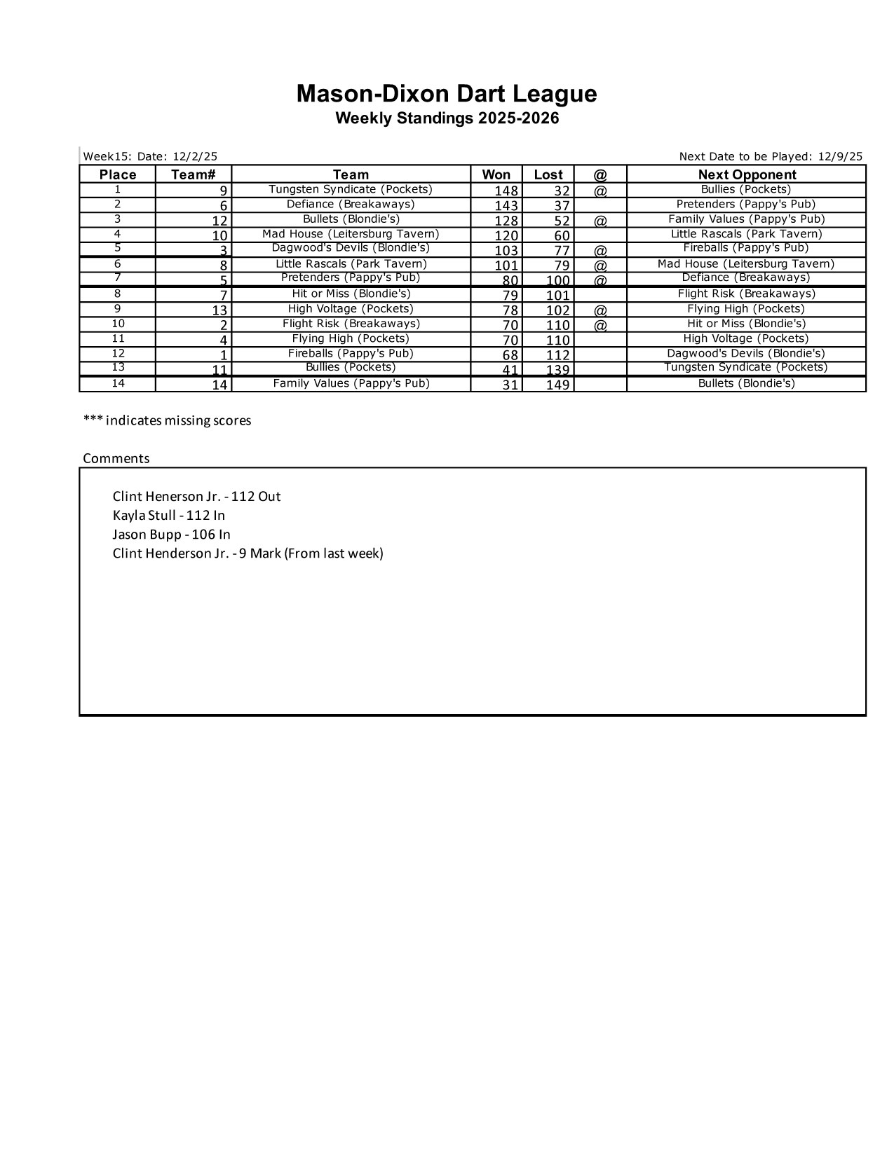 Week 15 Standings — HTML (easy load) or PDF (printer ready)