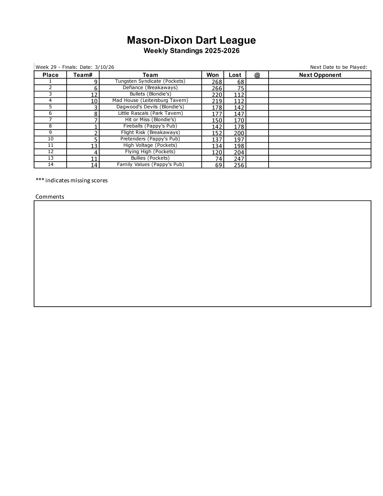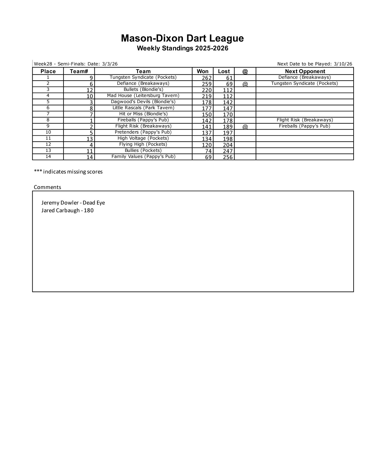 Week 26 Standings — HTML (easy load) or PDF (printer ready)